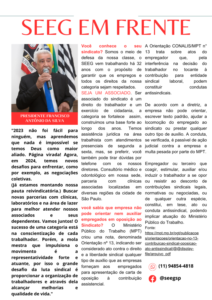 Em Destaque Ultimas Notícias SEEG EM FRENTE Por Imprensa SEEG / 6 de fevereiro de 2024 You may also like 34 anos da nossa história Por Imprensa SEEG / 30 de setembro de 2025 Informativo Por Imprensa SEEG / 11 de setembro de 2025 REAJUSTE CESTA BÁSICA Por Imprensa SEEG / 1 de abril de 2025 ATENDIMENTO ESPECIALIDADE CLÍNICO GERAL Por Imprensa SEEG / 10 de fevereiro de 2025 Post test Por SEEG / 7 de fevereiro de 2025 Navegação de Post REAJUSTE SALARIAL 2023APP SEEG SP